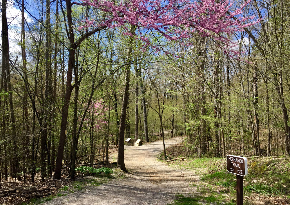 DeSoto Nature (1.2 Mile One Way) – a natural surface walking trail that includes two loops. The first loop is level, and the second loop has an easy uphill grade to a bench overlook. The trail features wooded hiking and beautiful views of Lake DeSoto while crossing the dam. Parking is available at DeSoto Park, 201 DeSoto Park Lane.